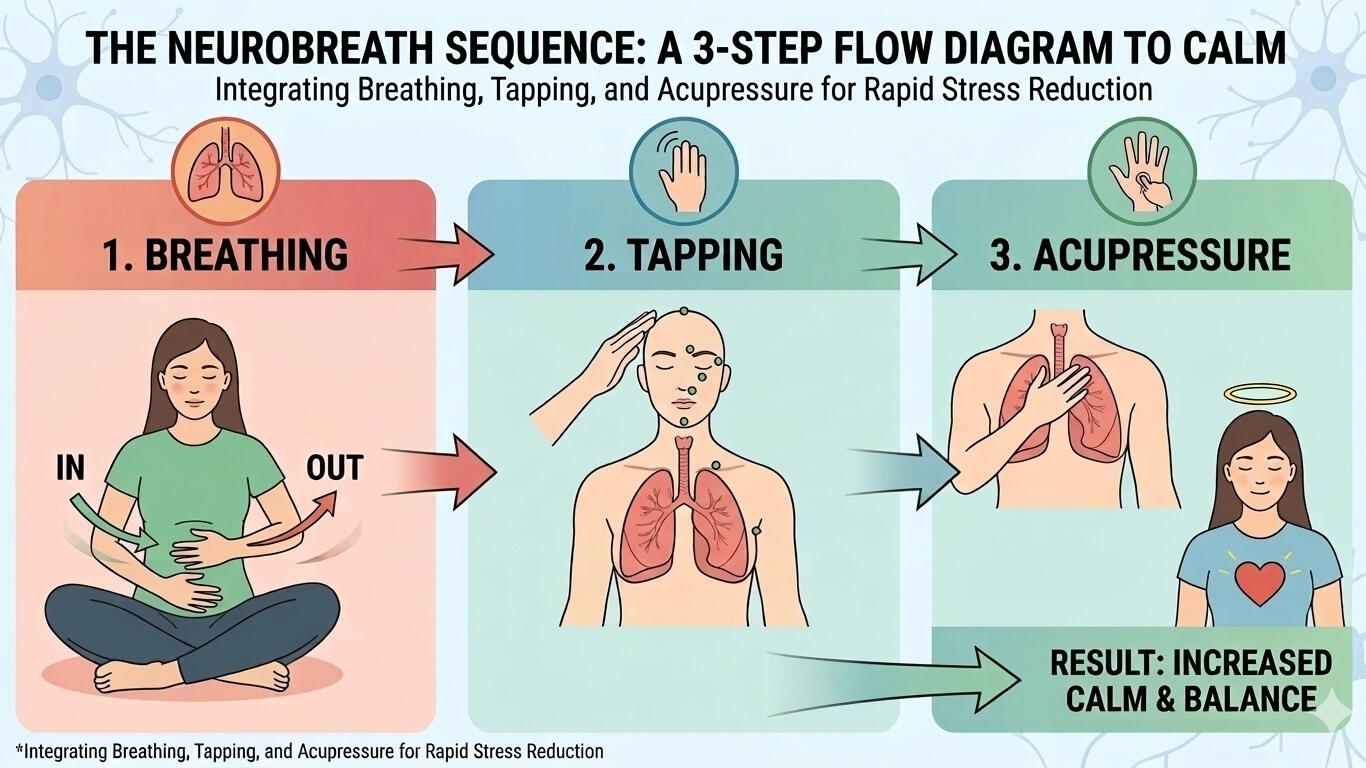 The nervous system responds strongly to signals of safety.Slow breathing, rhythmic tapping and acupressure stimulation can all help activate the body’s parasympathetic response — the state associated with rest, recovery, and regulation.The NeuroBreath Method simply combines these elements into a practical routine.